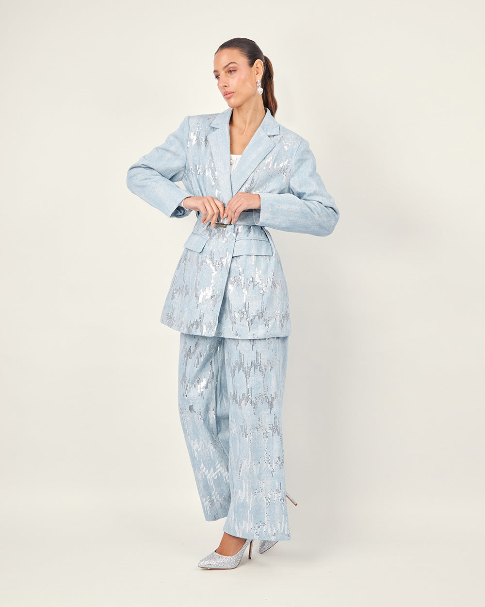 Saco celeste denim c/lentejuelas plateadas y cinturon