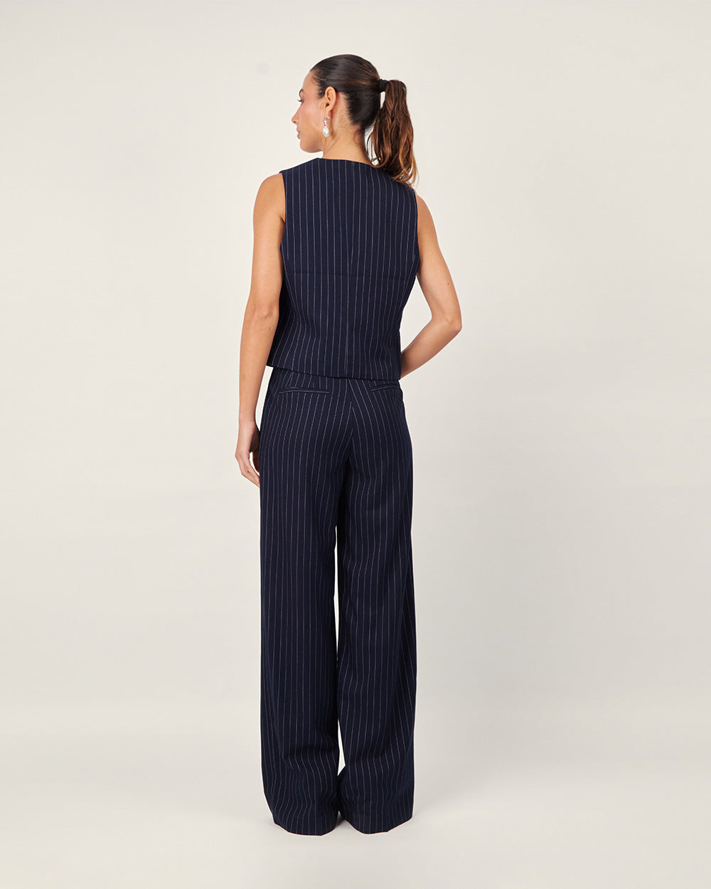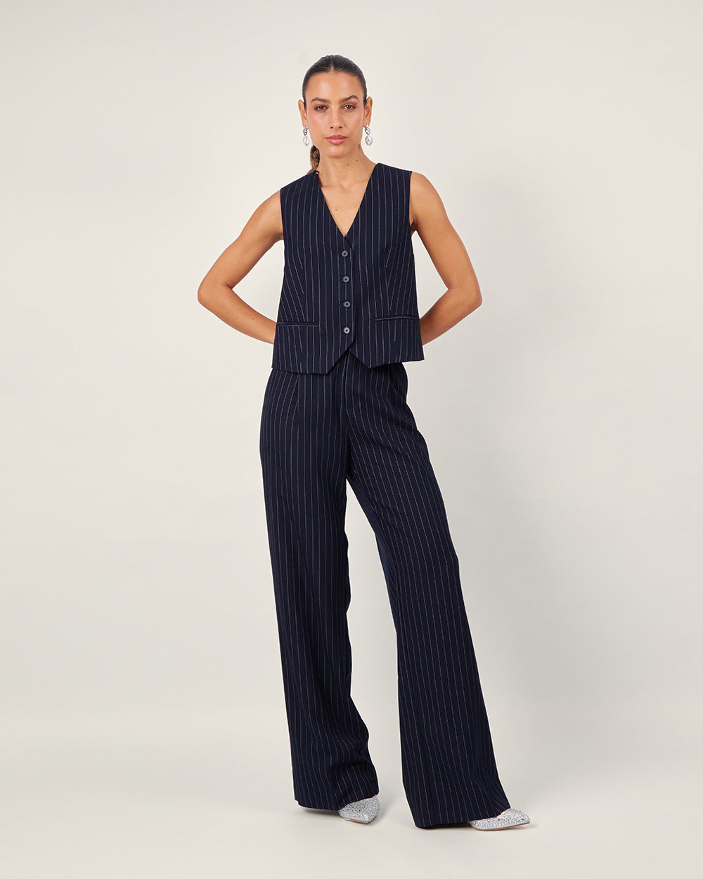 Chaleco azul tweed cuello v c/rayas y botones