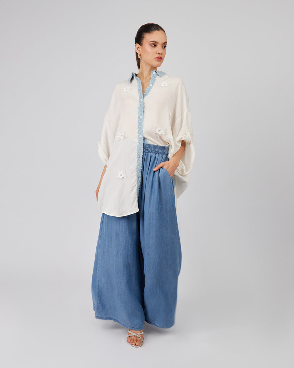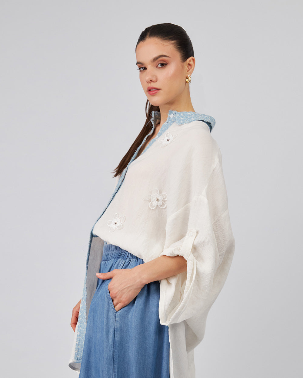 Camisa blanca manga 3/4 ajustable flores 3d y botones