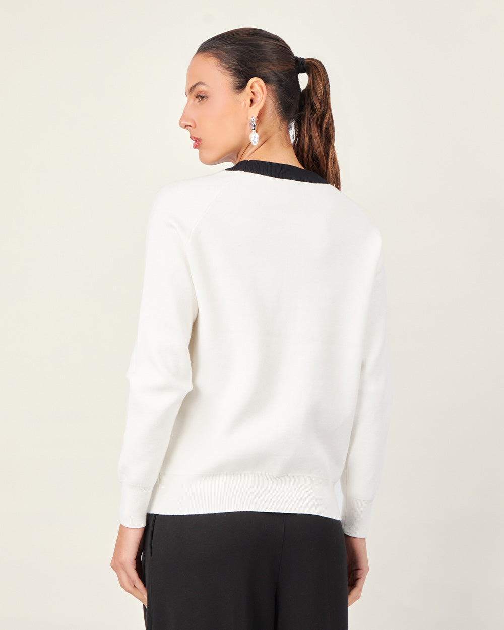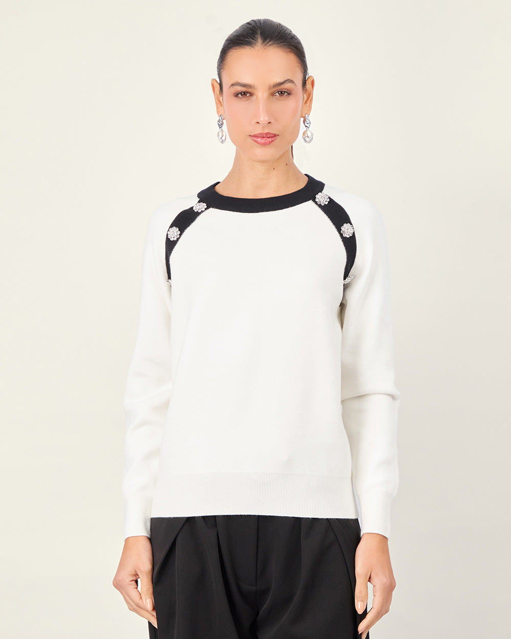 Sueter blanco de punto cuello redondo manga larga c/aplicaciones de piedras en forma de flor