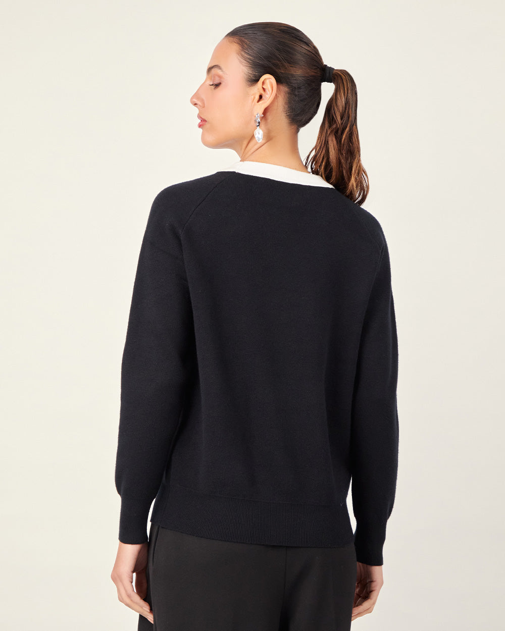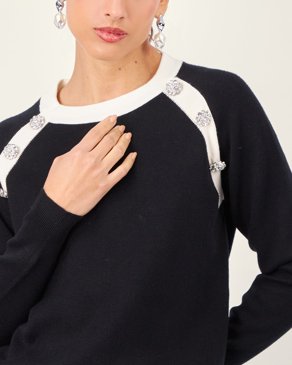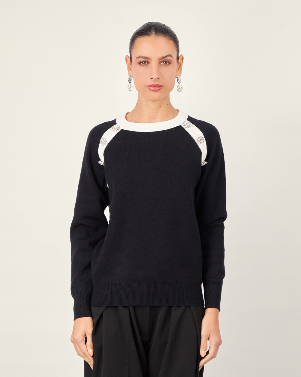 Sueter negro de punto cuello redondo manga larga c/aplicaciones de piedras en forma de flor