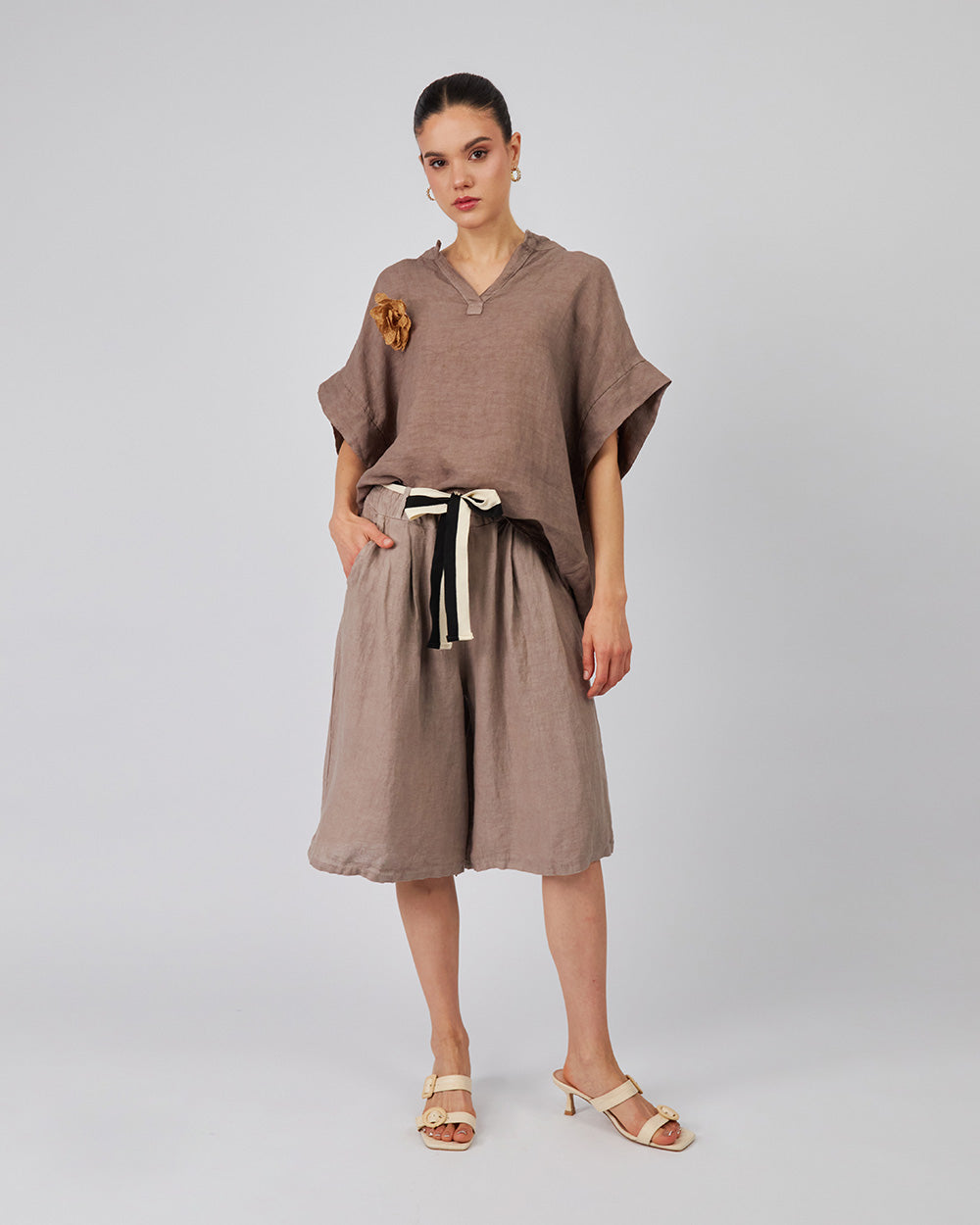 Blusa chocolate cuello en v con mangas anchas y flor de tela 3d