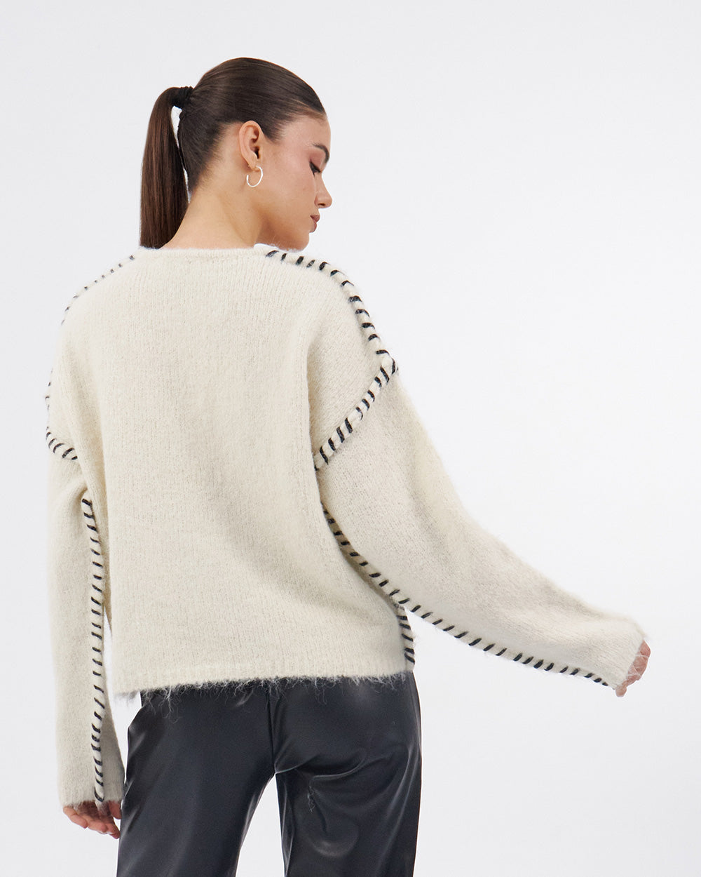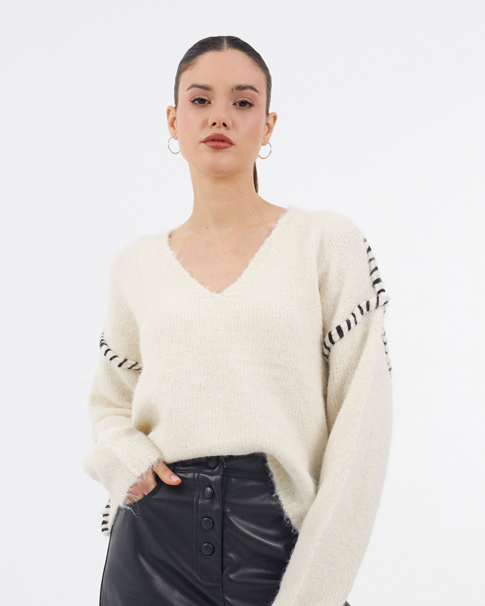 Sueter perla tejido cuello v manga larga c/costura hilo negro