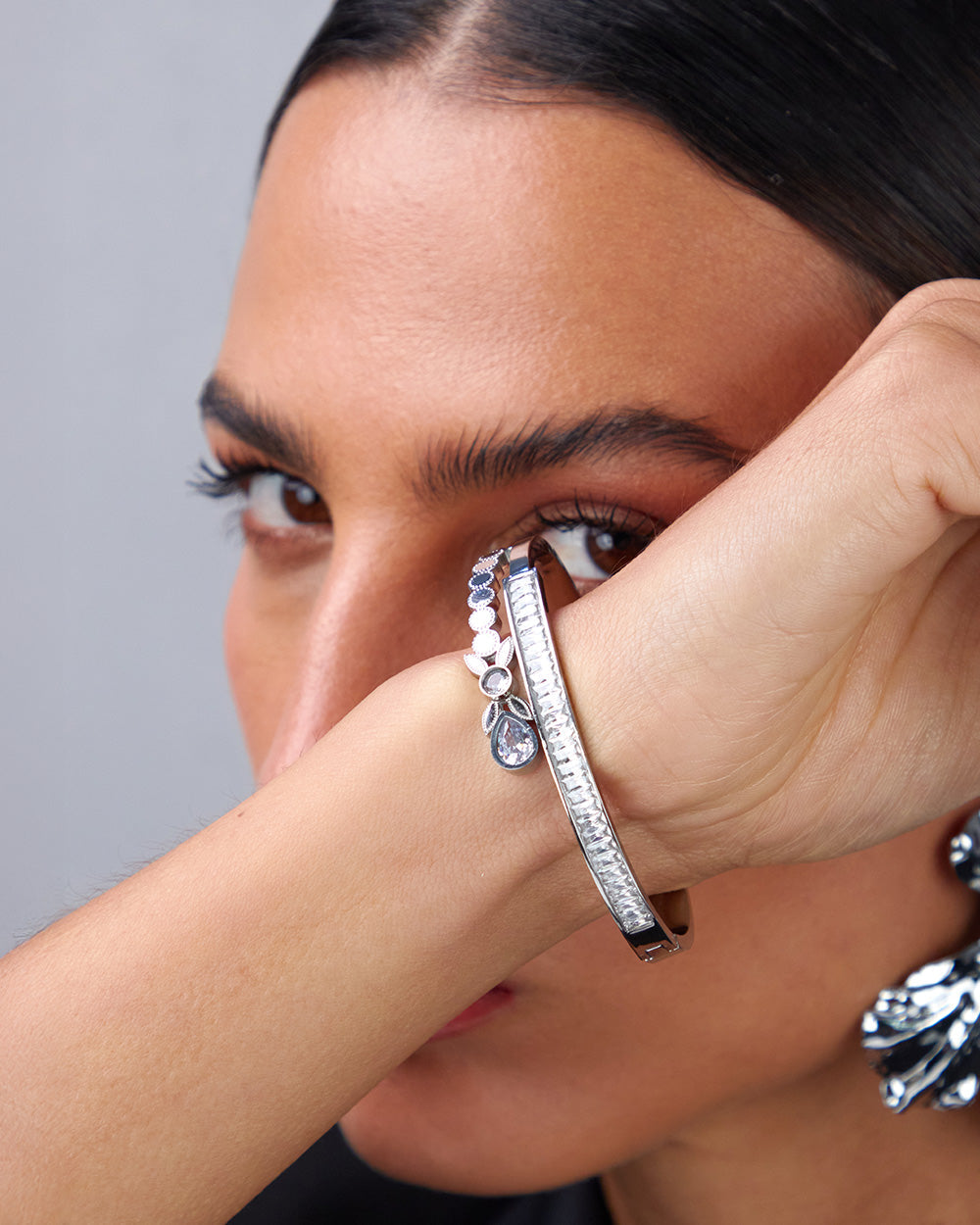 Brazalete plateado tira de piedras rectangulo, circulo y flor